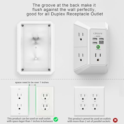【The Groove Design on The Back and Wide space 】- 5 AC outlets with 2.1 inches long space in between, larger than standard 1.5-inch socket. Larger spacing makes it easier to use for all kinds of equipment. The groove at the back make it flush against the wall perfectly, good for all Duplex Receptacle Outlet. NOTE: This product can be used on wall outlet with space lager than 1 inches in between ,This product cannot be used on outlets with more than 2 set of parallel sockets.