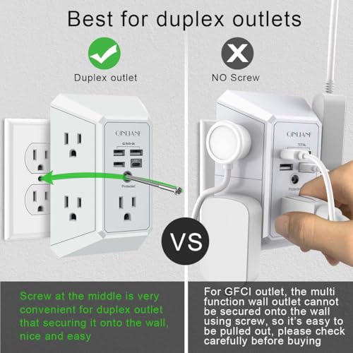 【 Multi Function USB Outlet】- Securing onto the wall design. Fit duplex outlet perfectly, just plug in to use. You get 5 AC outlet splitter (3 sides) with wide space in between; 4 USB charger ports; using the screw at the middle to secure it onto the wall for duplex outlet, so it is not pulled out when pulling the plugged in devices and loss power. Note: this works on duplex outlet only, other types of outlet like GFCI outlet cannot be secured onto the wall.Best Ideal Stocking Stuffers for Adults.